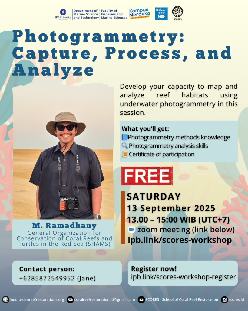 We are a collaborative learning platform based at the Faculty of Fisheries and Marine Sciences, IPB University, dedicated to advancing coral reef restoration in Indonesia and beyond. SCORES brings together practitioners, researchers, and enthusiasts to share knowledge, experiences, and innovations in reef restoration. Through our programs, we connect voices from across the globe, highlighting success stories, lessons learned, and the science behind restoration efforts. Our mission is to inspire, educate, and guide best practices to ensure healthier reefs for the future. Whether you’re a scientist, student, policymaker, or ocean advocate, SCORES invites you to join our community, learn from others, and contribute to restoring Indonesia’s precious coral ecosystems.