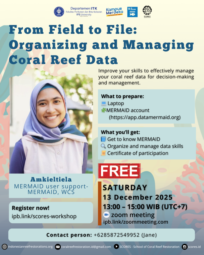 We are a collaborative learning platform based at the Faculty of Fisheries and Marine Sciences, IPB University, dedicated to advancing coral reef restoration in Indonesia and beyond. SCORES brings together practitioners, researchers, and enthusiasts to share knowledge, experiences, and innovations in reef restoration. Through our programs, we connect voices from across the globe, highlighting success stories, lessons learned, and the science behind restoration efforts. Our mission is to inspire, educate, and guide best practices to ensure healthier reefs for the future. Whether you’re a scientist, student, policymaker, or ocean advocate, SCORES invites you to join our community, learn from others, and contribute to restoring Indonesia’s precious coral ecosystems.
